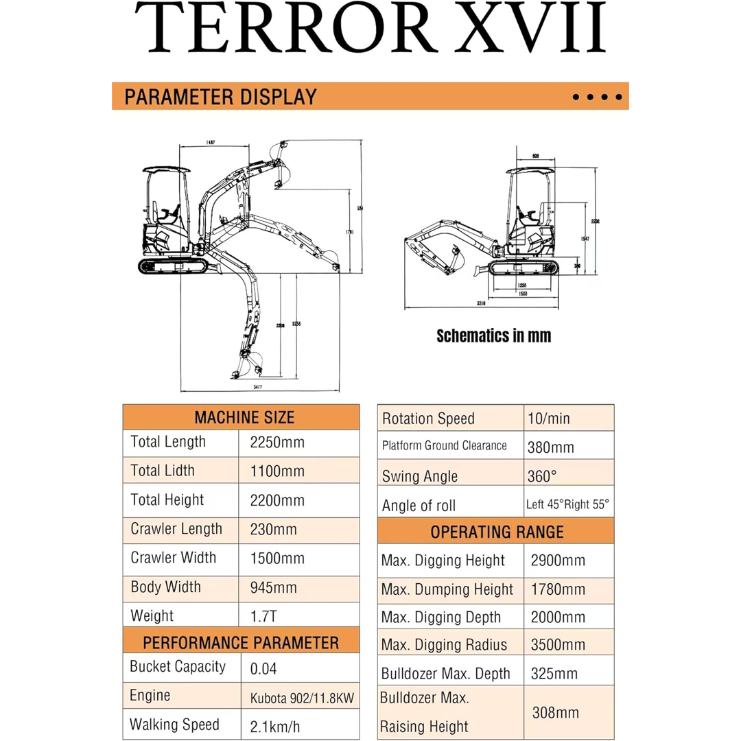 TYPHON TERROR XVII Lux Mini Excavator โ 1.7 Ton Trench Digger with Boom Swing, Canopy, 400mm Wide Bucket